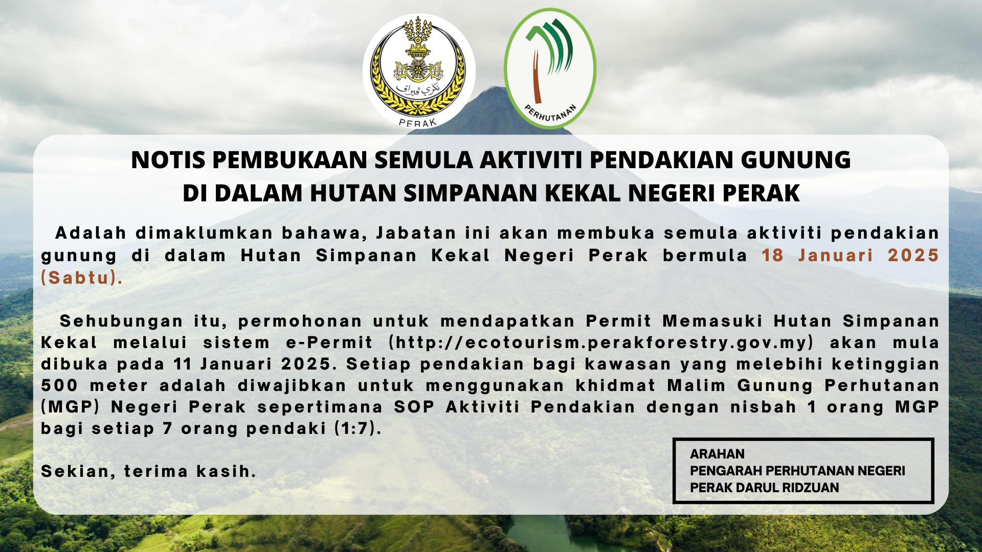 NOTIS PEMBUKAAN SEMULA AKTIVITI PENDAKIAN GUNUNG DI DALAM HUTAN SIMPANAN KEKAL NEGERI PERAK Terakhir dikemaskini: 23 Januari 2026