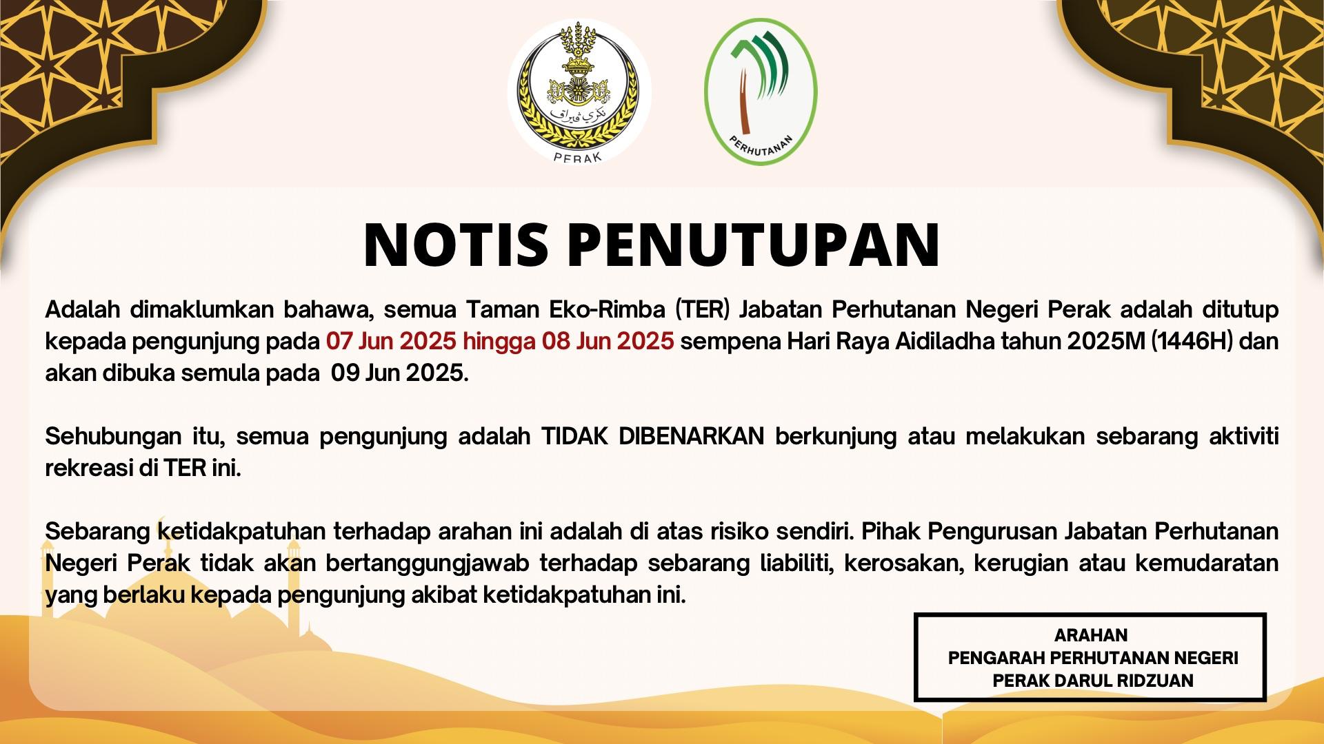 NOTIS PENUTUPAN TAMAN EKO-RIMBA (TER) JABATAN PERHUTANAN NEGERI PERAK Sila klik Surat Notis Penutupan (TER) Jabatan Perhutanan Negeri Perak disini di sini. Terakhir dikemaskini: 03 Jun 2025