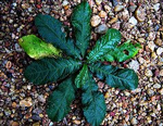 Tumbuhan ini tumbuh melata dan jangkahayat yang panjang dan boleh tumbuh sehingga 50cm. Daunnya tumbuh dengan padat pada bahagian bawah batang dan susunan daunnya secara berjambak. Tepi daunnya bergerigi, dipenuhi dengan rerambut berwarna keputihan, bentuk daun pelbagai bentuk, bujur atau bulat di bahagian hujung daun dan mengecil pada bahagian pangkal daun. Tangkai daun pendek dan berbulu.